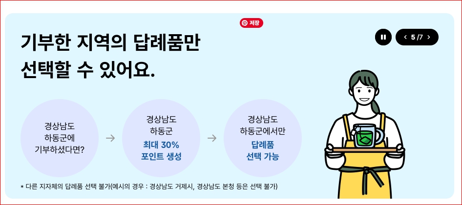 - 답례품: 기부금의 30% 이내 제공(포인트로 선택)