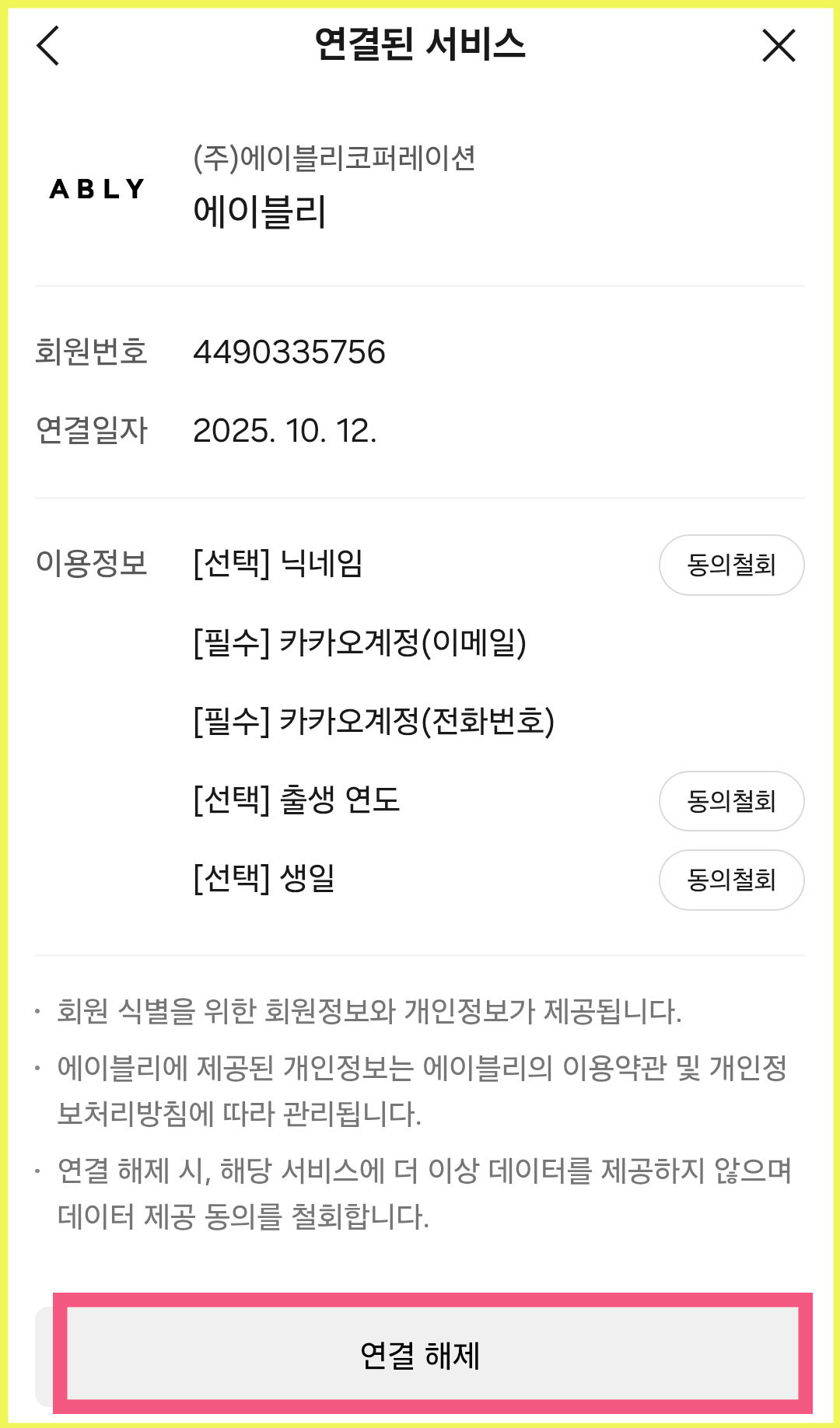 - 연결 해제 / 개인정보 제공 철회 클릭